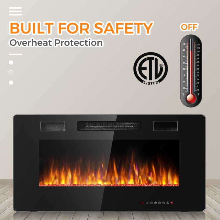 There are 2 install ways, wall mounted or insert, and both are space-saving and simple to install with thinner thickness. This electric fireplace comes with 2 heating settings--low temperature of 750 W and high temperature of 1500 W. More, this electric fireplace heater simulates real flame with 12 flamer colors and bed colors to create a cozy atmosphere as well traditional fireplace. While with 5 flame brightness settings ranging from dim glow to full glow, allowing you to adjust the flame to the brightness you want. The addition of remote control with the panel gives the comfort of operating and changing the settings of the heater from our couch or bed. More importantly, ETL certification and overheat protection ensure safety. This elegant black glass fireplace with timer adds a modern touch and an ideal touch to your home.