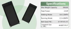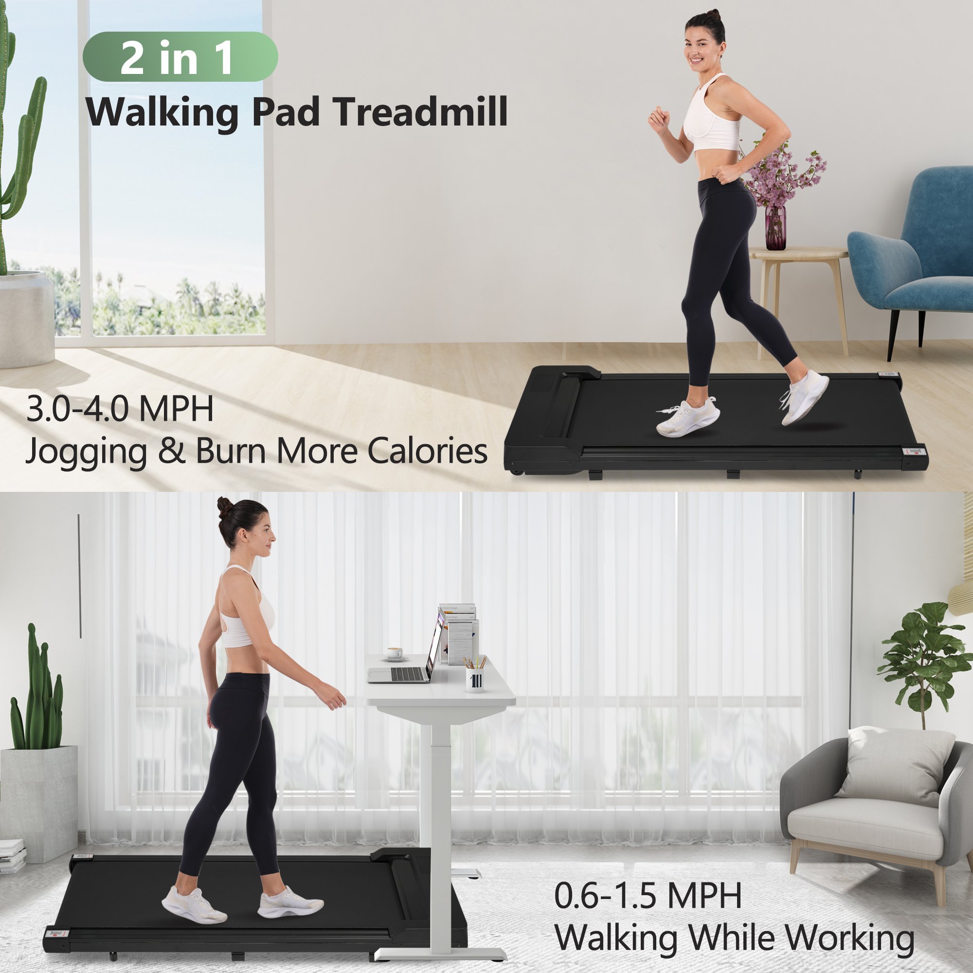0.6-4MPH -- The walking treadmill with a powerful 2.5 HP motor provides a large carrying capacity of up to 300 pounds.This under desk treadmill provides a speed of 0.6 - 4MPH, which is adequate for most trainees. The right home treadmill can help you integrate fitness into your daily life, and enjoy exercise in the comfort of your home regardless of the weather.NO INSTALLATION -- No need to install, just take this walking pad out and use it. The dimension of the electric treadmill is 44.88"*19.3"*3.93". With transport wheels, you can easily move and store it under a sofa, bed, or behind a door, which greatly frees up some floor space.FITNESS TRACKING DISPLAY -- Our portable Treadmill is designed with a LED display to show speed, distance, time, and calories burned, allowing you to visualize your exercise and maintain motivation. You can control the speed or stop the treadmill by pressing the remote control.PROTECT YOUR KNEES -- 5 layer anti-slip belt of this desk treadmill is designed to absorb the force of your step, to protect your joints and ligaments from damage.NO NEED TO PAIR REMOTE CONTROL REMOTE -- The remote control comes with two AAA batteries. The remote control does not need to be paired. Just install the batteries and you can use it.